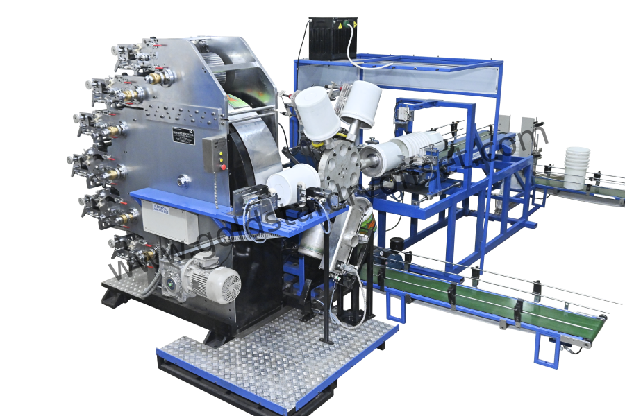 The Classy Pail Printing Machine is a highly advanced printing solution that guarantees high printing accuracy. This Six color dry offset pail printing machine includes features like Auto Loading, Flame treatment with auto ignition, 360 degree printing with precise registration & automatic orientation, Instantaneous UV drying, Auto ejection with exit conveyor, Lower ink consumption, Less floor space, and is suitable for conical & cylindrical container (Wide Mouth). The machine is equipped with an AC motor with variable AC frequency inverter for variable speed, acceleration, and deceleration control, Anti-Backlash plate cylinder helical gear, and Micrometer lateral and radial plate cylinder adjustment. The Complete vacuum system with a pump holds each container on mandrels at the necessary position, and Positive timing throughout the machine ensures that each container is printed accurately. This Classy pail printer can printing about 1000/1100 impression per hour with a suitability to print from 1 litre pail to 20 litres of pail.
